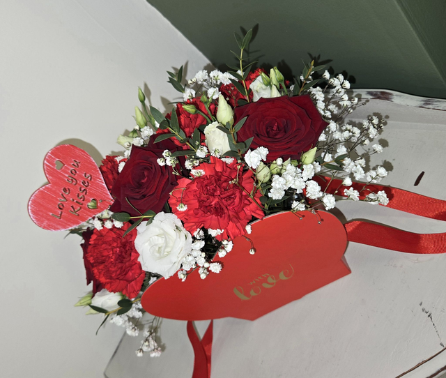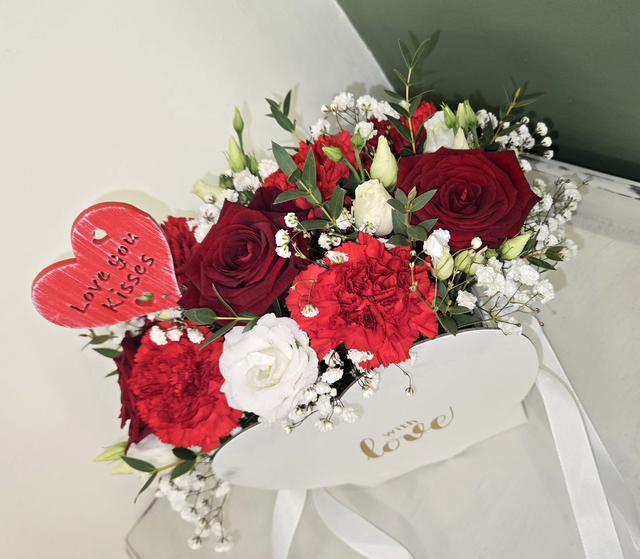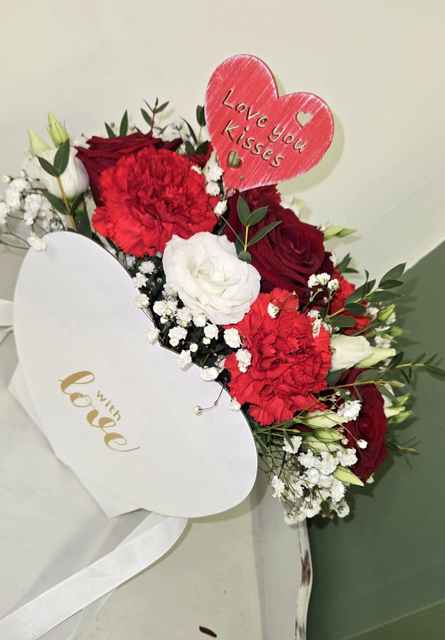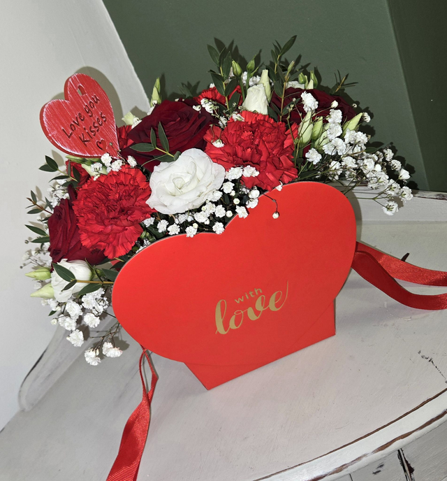 Designed in a red heart-shaped gift bag printed with “With Love”, this arrangement features a beautiful mix of rich red roses, vibrant red carnations, and soft white blooms, delicately finished with gypsophila and seasonal foliage. A decorative heart pick reading “Love You Kisses” completes the look, adding an extra sentimental touch.